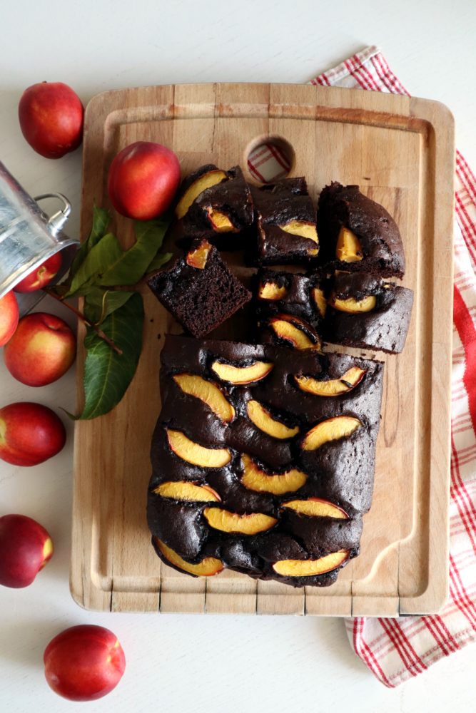 Inca este sezonul piersicilor si caiselor, asa ca eu zic sa profitam la maxim. Nu sunt mare fan ciocolata, insa o brownie umeda si aerata asociata cu aciditatea si aroma piersicilor este in topul preferintelor mele.