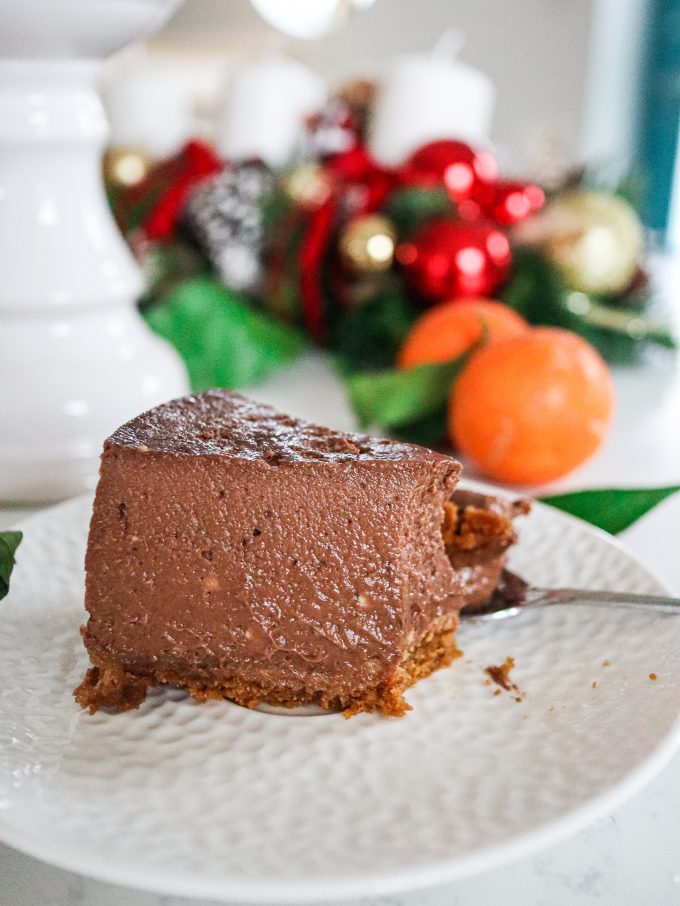 Tocmai vedeti in imagini cel mai cremos si fin cheesecake pe care l-am facut si mancat vreodata. Blatul de biscuiți este ferm si usor crocant, iar crema vine în completare cu textura foarte delicata. Gustul ciocolatei cu cel al iernii, de citrice, se echilibreaza intr-un mod subtil, dar perfect!