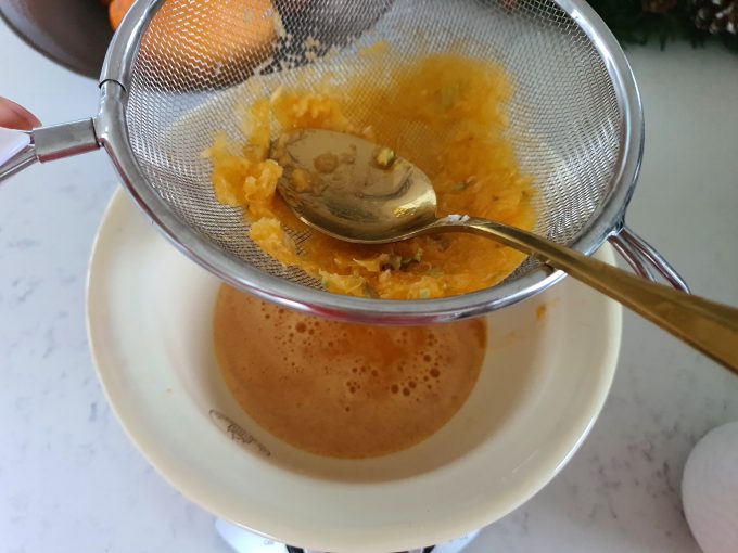 Blenduim clementinele, apoi le trecem printr-o sita pentru a elimina sâmburii si fibrele