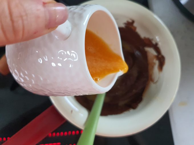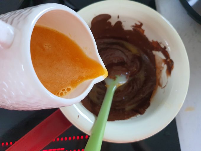 Topim ciocolata pe baie de aburi, apoi o amestecam cu sucul/piureul de clementine