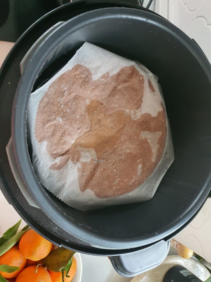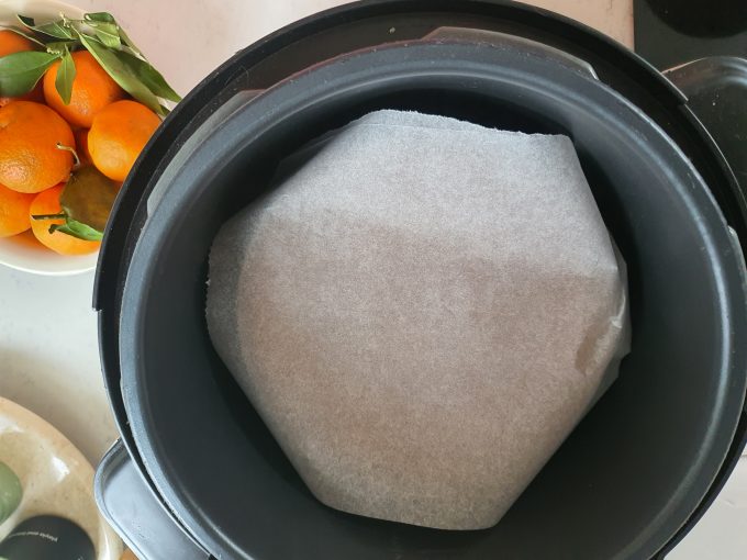 Punem cu grija forma de tort, apoi punem pe deasupra hartie de copt pentru a colecta condensul
