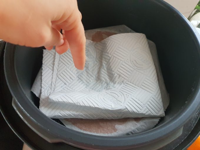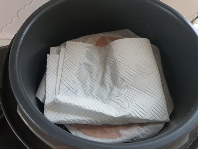 Dupa ce s-a eliminat presiunea, ridicam capacul si indepartam cu grija foaia de copt. Daca mai este apa pe suprafata cheesecakeului, o indepartam cu ajutorul unui prosop de hartie – il punem cu grija pe deasupra ca sa absoarbă lichidul