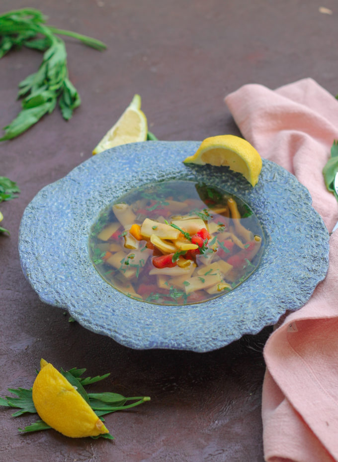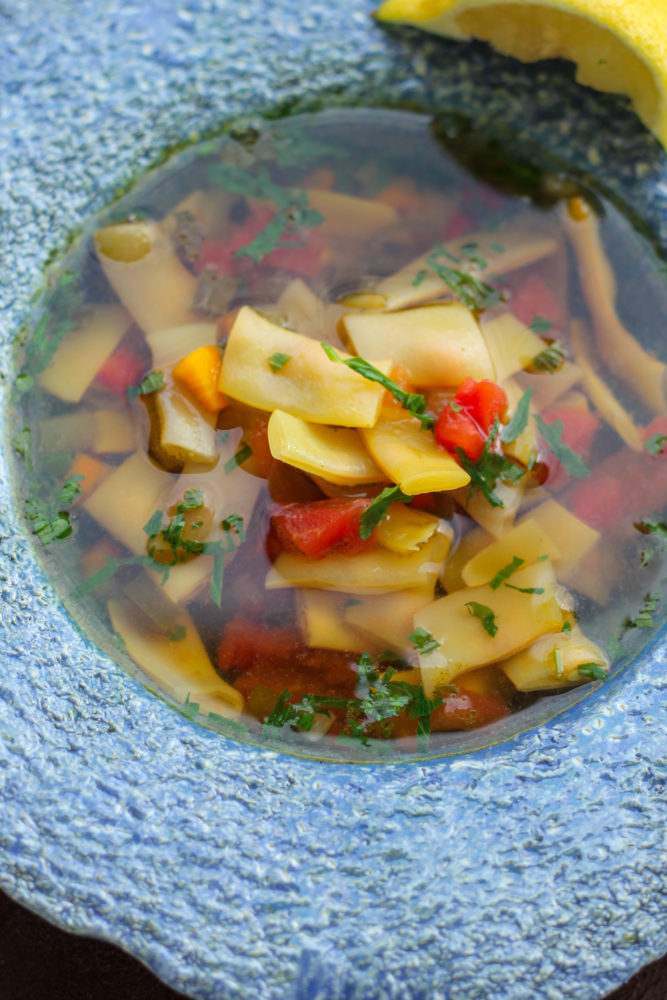 Ciorba de fasole pastai preparata la , cu alte cuvinte, o ciorba usoara, clara, cu legume si gust de vara.