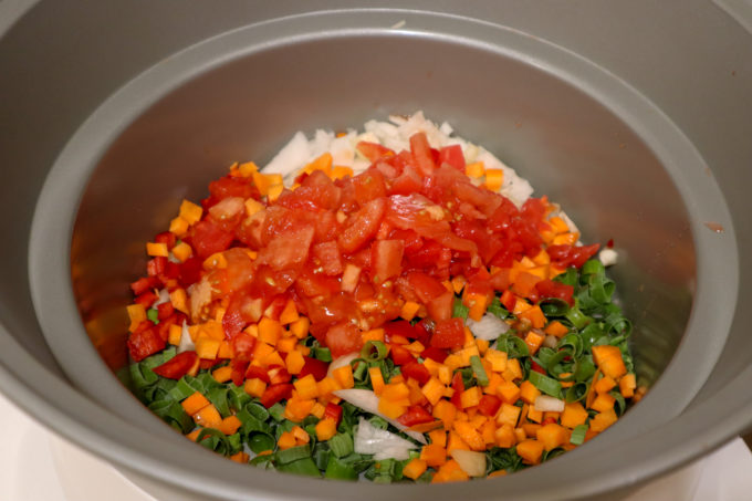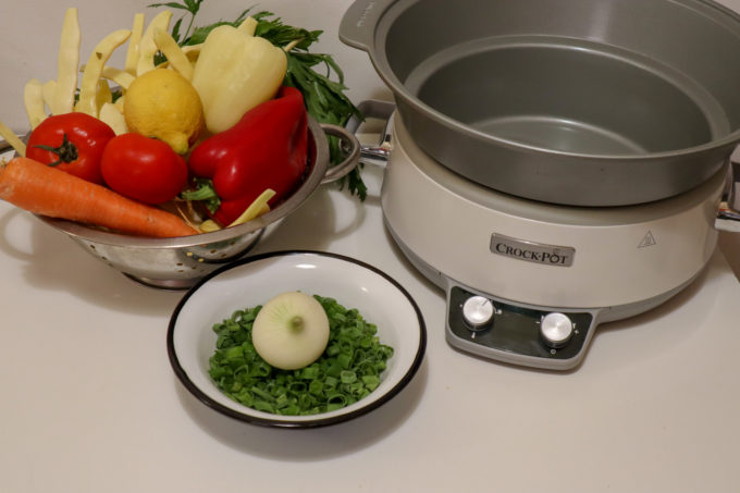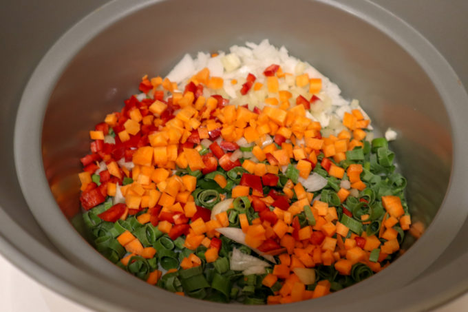 - Taiem ceapa, ardeii si morcovul marunt si le adagam in vasul slow cookerului