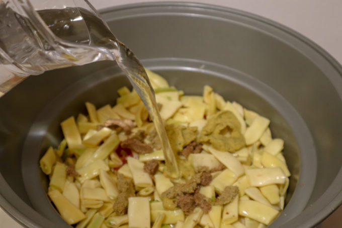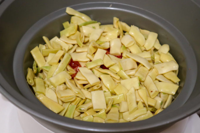 - Taiem fasolea in bastonase de 2 cm si o adaugam in slow cookerul Crock Pot