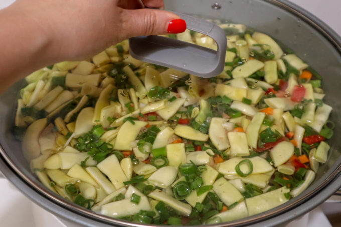 - Daca avem supa punem 2 lutri de supa si 2,5 de apa, daca nu, 4 cuburi de supa si 4,5 l apa