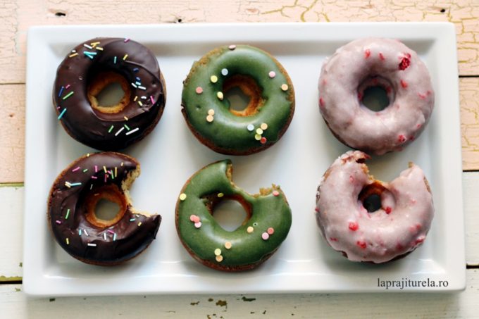 Credeam ca trendul acesta nou cu gogosile americane glazurate este doar o fita si ca gogosile astea nu au cum sa fie decat niste mini checuri in forma simpatica. Ei bine, m-am inselat destul de tare. Am tot cautat retete pe net si pana la urma am gasit una care m-a pus pe ganduri. Daca un aluat contine lapte batut/chefir/iaurt si ulei, atunci nu are cum sa fie uscat sau inecacios asa cum credeam eu… Asa ca n-am mai stat pe ganduri si am zis sa fac gogosi americane, in premiera alaturi de voi in live-ul de marti seara. Pentru a nu face un aluat de un singur fel, m-am gandit ca ar fi mai interesant sa impart cantitatea in trei parti si sa fac gogosile in trei arome si glazuri diferite: ciocolata, capsuni si lamaie. Gogosile americane sunt foarte diferite de ale noastre: acestea se fac la cuptor, iar aluatul este unul moale, aproape curgator, spre deosebire de gogosile romanesti care se prajesc in baie de ulei, iar aluatul este unul facut cu drojdie.