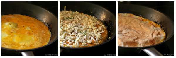 - dupa ~30 de secunde adaugam jumatate din catitatea de cas/cascaval, cateva fire de cimbru, apoi punem o lipie peste omleta – mai lasam mai putin de un minut cat sa se inmoaie putin cascavalul – care actioneaza si ca „lipici”