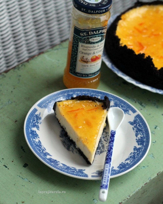 - Lasam cheesecakeul la racit, apo intindem pe deasupra un strat subtire de gem cu portocala cu ghimbir de la St. Dalfour.
