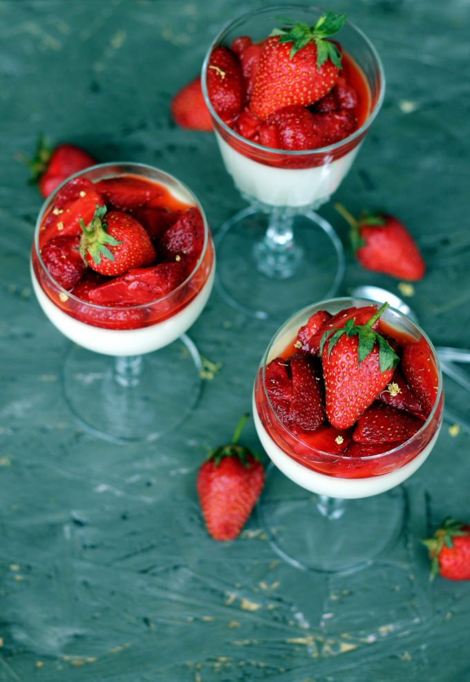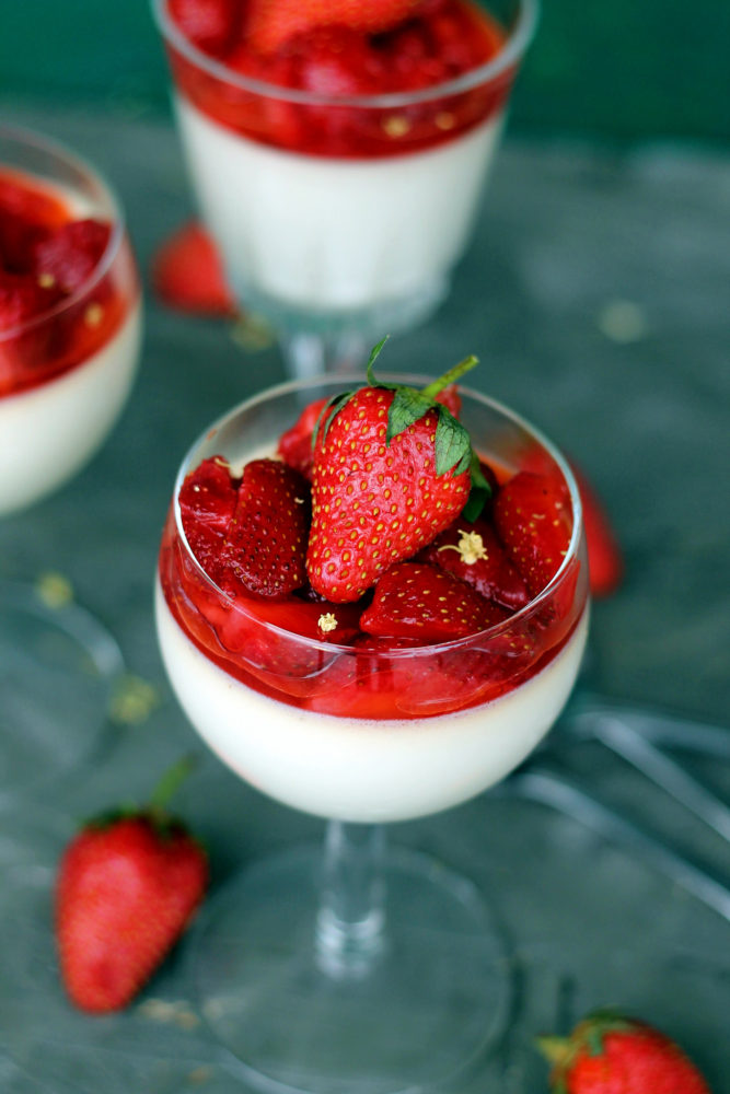 V-am anuntat deja de acum o luna ca va fi o vara cu multe deserturi racoroase. Sambata am facut o prajitura cu ciocolata si fara faina peste care am pus capsuni macerate in miere si zeama de lamaie. Cred ca manata de entuziasm am pus la macerat prea multe capsuni. Bineinteles, puteam sa le mancam ca atare, exact cum mananca italienii, insa mie mi-a venit o idee si mai buna: de ce sa nu alint cu ele o panna cotta infuzata cu soc si toping de capsuni macerate in miere si zeama de lamaie. Anul asta m-am cam moscait, am ratat sezonul de soc in Bucuresti. Mi-am amintit ca am primit de la o cititoare o punga de flori de soc (sa-mi fac ceai) si m-am gandit ca vor merge de minune pentru a infuza compozitia pentru panna cotta. Si ghiciti ce: a mers de minune.