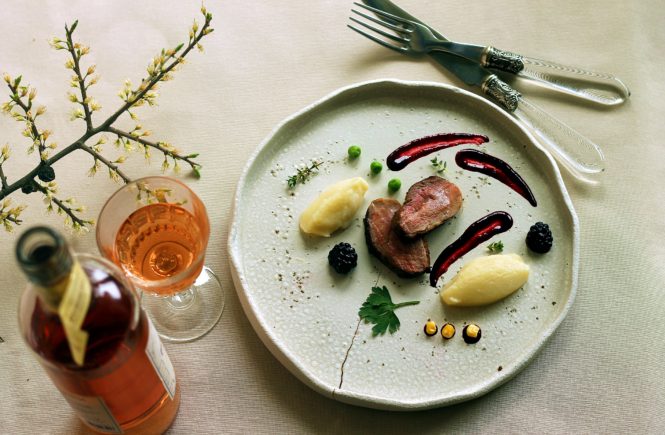 Piept de rata cu sos de mure si vin roze, alaturi piure de pastarnac si mar