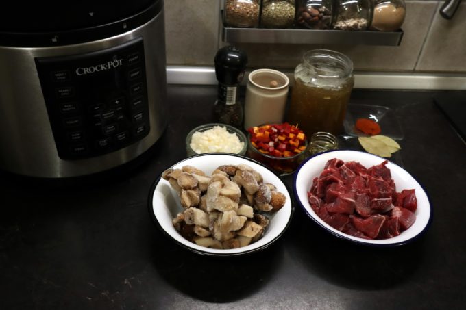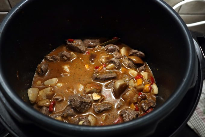 Ce nu stie mama e ca spre deosebire de ea, eu nu trebuie sa pazesc oala in care pregatesc carnea, sa adaug „putina apa din cand in cand” sau sa o verific. Fac toata treaba in . Rumenesc mai intai carnea la functia „saute”, o scot, calesc ceapa si ardeii, adaug carnea inapoi, pun ciupercile, mirodeniile si supa, pun capacul, sigilez si in 25 de minute am o tocana de vita cu hribi care concureaza cu a ei. Functia de gatire sub presiune este o adevarata revelatie pentru mine. Sunt inca uimita cat de frageda a iesit carnea sau cat de repede a fiert fasolea pe care v-am aratat-o data trecuta.