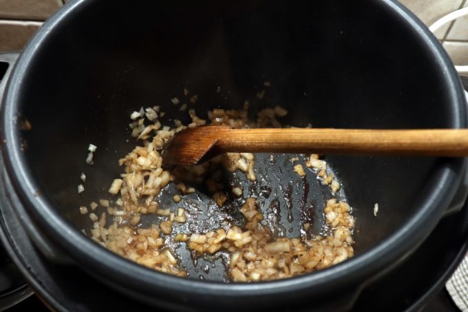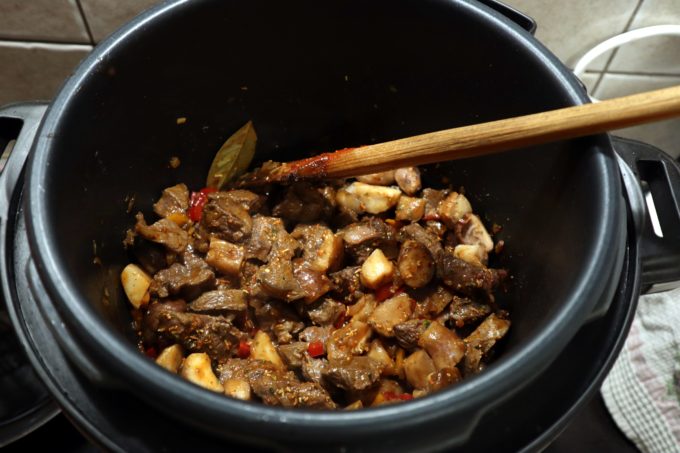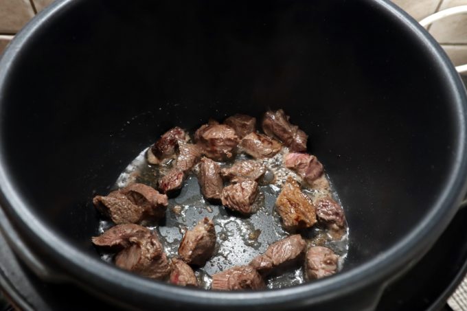 Adaugam 2 linguri de ulei in vasul , fara sa acoperim vasul, setam functia „saute” – sotare, apoi punem ½ din cantiateta de carne rumenim cuburile pe toate partile
