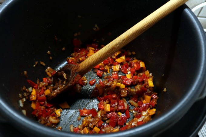 Dupa ce s-a inmuiat ceapa (operatiunea dureaza 4-5 minute), adaugam lingurita de boia afumata, amestecam, apoi adaugam ardeiul gras is mai calim 1 minut